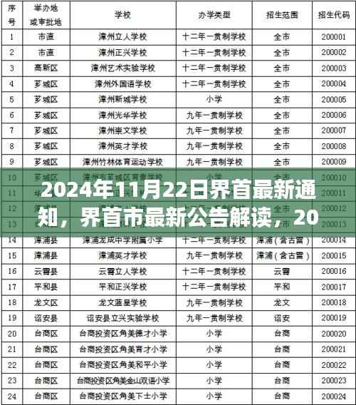 随着时代的进步和社会的发展,界首市作为安徽省的重要城市,不断推出适应时代需求的公告与通知,本文将围绕“2024年11月22日界首最新通知”进行全面而详尽的评测与介绍,以期帮助广大市民和行业内人士更好地了解其内容、特性及目标用户群体。