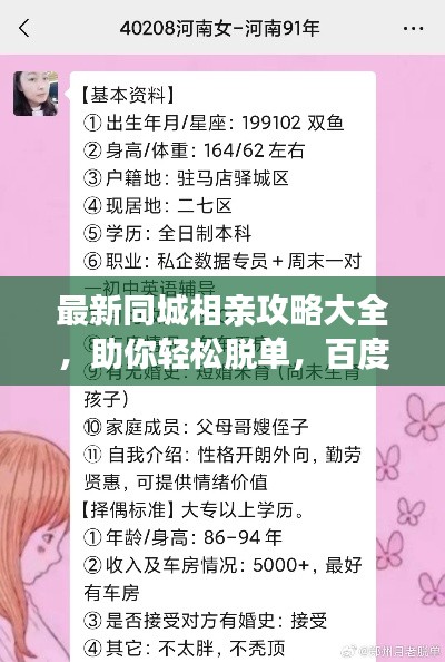 随着现代生活节奏的加快,越来越多的人选择在同城范围内寻找合适的伴侣,相亲作为一种传统的婚恋方式,依然受到广大单身男女的关注,本文将为你提供最新的同城相亲攻略,助你顺利脱单,找到心仪的另一半。