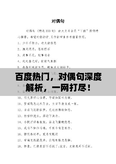 作为最大的中文搜索引擎,百度为我们提供了获取对偶句相关信息的便捷途径,当你在百度上搜索“对偶句”时,你会得到大量的相关信息,包括对偶句的定义、分类、作用、应用场景等,百度还能为你提供相关诗句、名家论述、研究论文等,让你更深入地了解对偶句的魅力。