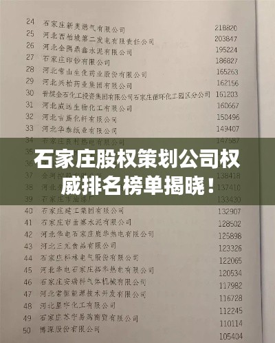 随着经济的发展,石家庄作为河北省的重要城市,其金融领域也在不断发展壮大,股权策划作为一个新兴的金融领域,已经逐渐受到越来越多企业的关注和重视,本文将介绍石家庄股权策划公司的排名,以便为需要的企业提供参考。